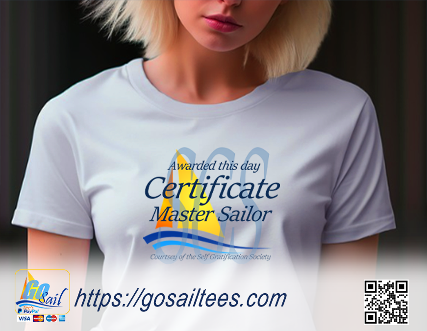 GoSailTee's original design "CERTIFICATE MASTER SAILOR AWARD" "Courtesy of the Self Gratification Society" is a solid cotton t-shirts in a variety of sizes and colors. Pick your size and color by clicking the button to check out.
